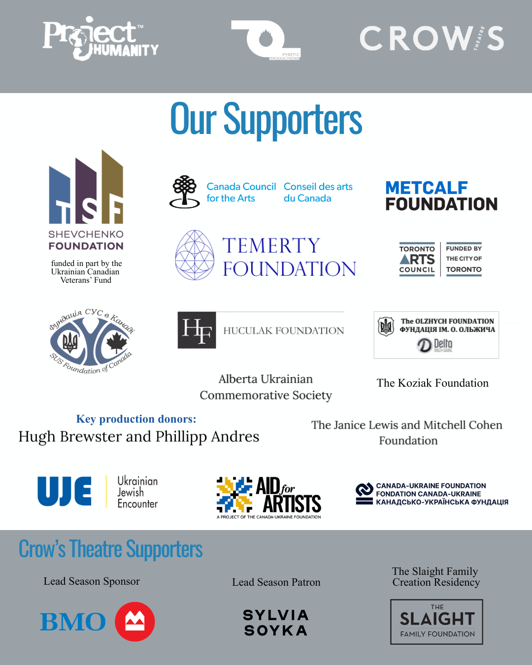Foundations: The Shevchenko Foundation, Metcalf Foundation, Temerty Foundation,Janice Lewis and Mitchell Cohen Foundation, SUS Foundation of Canada, Huculak Foundation, Olzhych Family Foundation, Alberta Ukrainian Commemorative Society, and the Koziak Foundation.